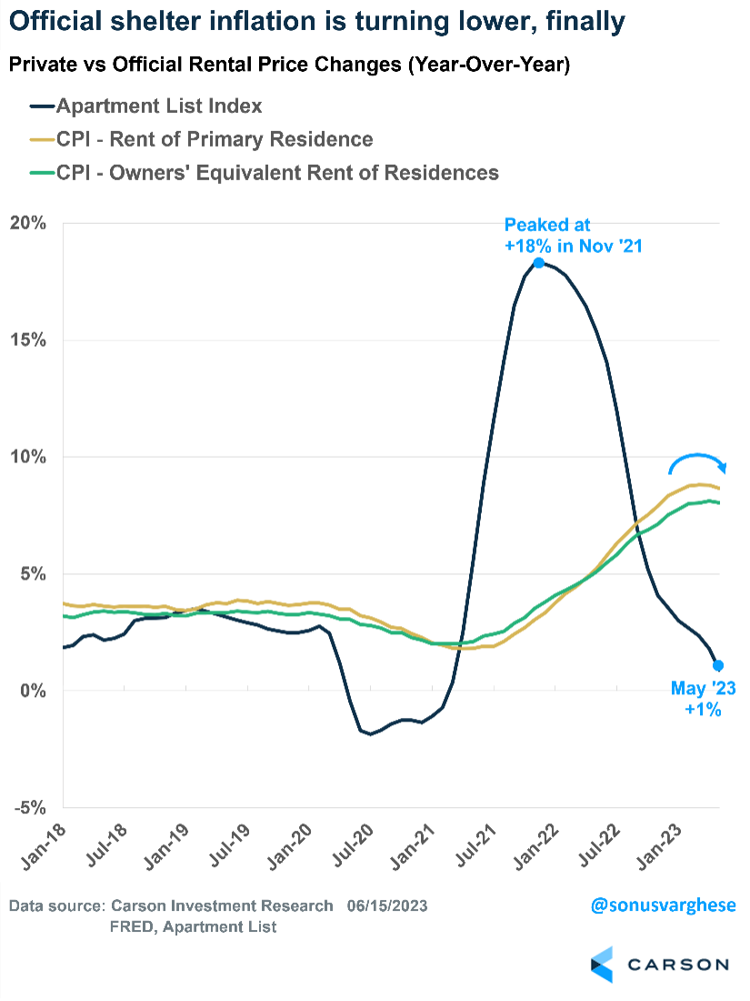 The good news is shelter inflation may be at an inflection point. While private data have shown rents decelerating for more than a year now, the official data, which has a significant lag, is just beginning to turn around. It is a bit like turning an aircraft carrier, but core inflation should soon begin to decelerate on the back of falling shelter inflation.