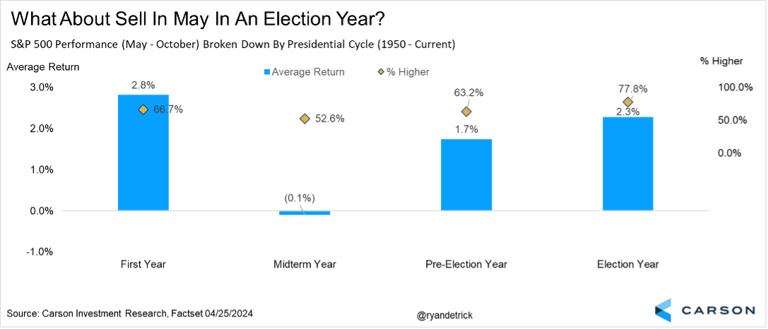 Not to mention election years tend to see a summer rally and strength during these six months, with the May through October period up 2.3% and higher an impressive 77.8% of the time.
