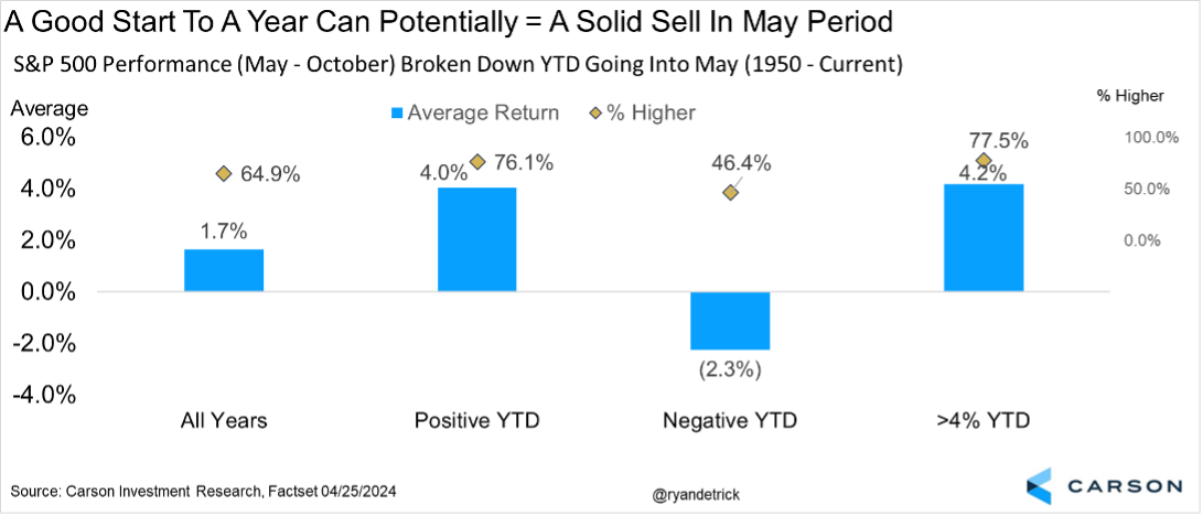 Lastly, how the market is doing going into these six months matters. Some of the worst “sell in May” periods have taken place when stocks were down before May began, whereas if stocks were positive, the following months improved. In fact, when the S&P 500 was up more than 4% for the year as of the end of April, as it likely will be this year, the following six months gained 4.2% on average and were higher nearly 78% of the time.