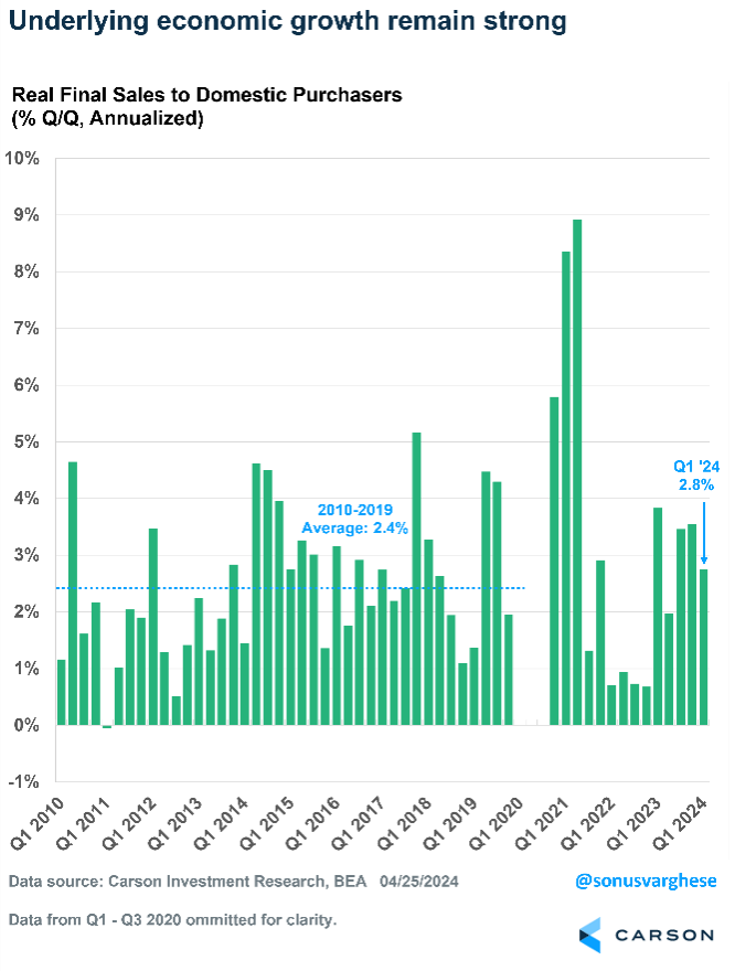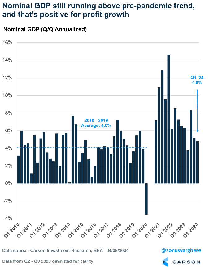 Of course, a strong economy means inflationary pressures are greater. The first quarter showed some evidence of that, which indicates interest rates are likely to stay higher for longer. Stronger economic growth plus more inflationary pressure means the economy is growing quite rapidly in nominal terms (before adjusting for inflation). That’s important because nominal GDP growth is ultimately where profits originate. Nominal GDP growth rose at an annualized pace of 4.8% in the first quarter, much faster than the pre-pandemic trend of 4.0%. The underlying numbers point to a continuation of this above-trend pace. That’s positive for profit growth, which is ultimately what matters for markets over the long run and an important factor as to why we continue to favor stocks over bonds.