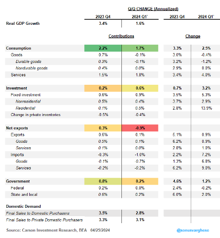It’s clear how the change in inventories and net exports were a significant drag, pulling GDP growth lower by 1.21% when combined. Net exports were driven down by a surge in imports, as U.S. households and businesses bought more from abroad than they did in the fourth quarter of 2023.