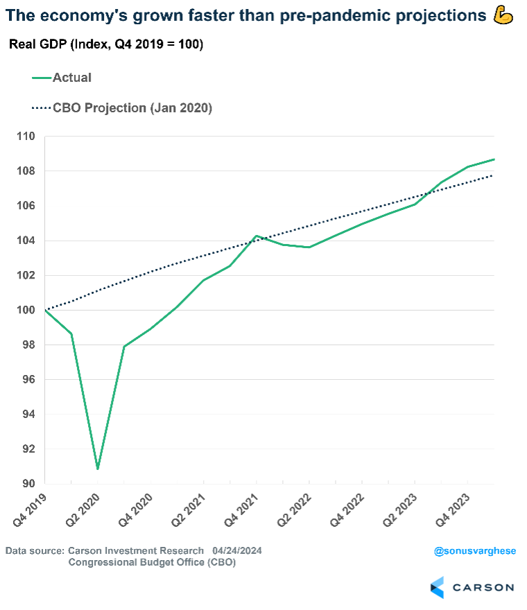 As noted above, economic growth remains strong when factoring in the most important parts of the economy: household consumption, investment, and even government spending. What’s amazing is the economy has grown at a faster pace than the Congressional Budget Office (CBO) forecasted in January 2020. After adjusting for inflation, the economy is almost 1% larger than the CBO projected. That’s despite 1) a worldwide pandemic and 2) the most aggressive rate-hike cycle by the Federal Reserve in 40-plus years.