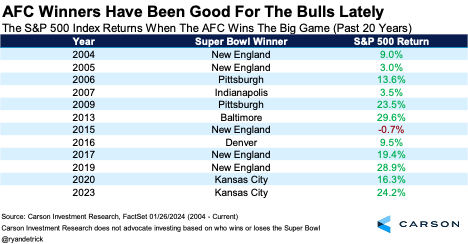 So, it is clearcut that investors want the 49ers to ground the Chiefs and win, right? Maybe not, as stocks have gained the full year 11 of the past 12 times when a team from the AFC won the championship going back 20 years. In fact, the only time stocks were lower was in 2015, when the full year ended down by 0.7%, so virtually flat.
