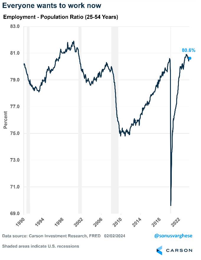 The prime-age employment-population ratio is 80.6%, matching the highest recorded in the last cycle in January 2020, when the economy appeared to be in pretty good shape (pre-COVID). It’s not far below the highest level recorded over the past year when the ratio hit 80.9% in July. It indicates that more people are working and want to work than at any point between 2001 and 2020. In fact, for women, the ratio is at 75%, which is higher than anything recorded in history prior to 2023 (the highest was 75.3% in October 2023).