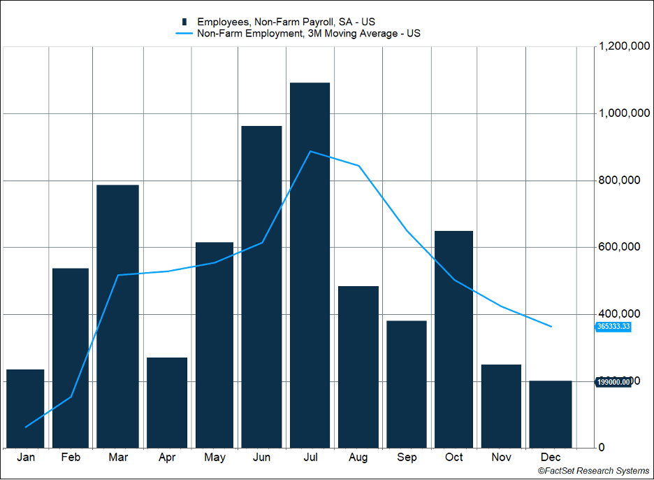 The U.S. employment report, released later in the week, provides insight into the economy the Fed is trying to tame. The December report was released Friday and, while the headline number of new jobs was below expectations, the report included good news for the job market. According to the establishment survey, December nonfarm payrolls increased by 199,000, which was below expectations of 400,000. This miss can be attributed to a lag in hiring in leisure and hospitality, likely caused by the powerful Delta and emerging Omicron variants. However, payrolls from the previous two months were revised upward and capped off a year where 6.4 million jobs were created, a record for the U.S. economy.