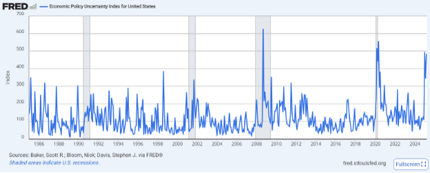 Unpredictability is part of Trump’s MO, and he is capable of deploying it very effectively. But while unpredictability can be powerful when negotiating, it can create a difficult environment for businesses. We’ve already seen this come through in increased mentions of tariffs in earnings reports and surveys such as CNBC’s surveys of business CFOs. Companies put a lot of capital at risk based on expectations of future profits, and generally want policy clarity. Businesses also do not want a president who interferes with capital markets. An uncertain policy environment can make it harder to do business, although sometimes it does also present opportunities. Initially viewed as a small risk, it’s clear uncertainty around some policies has weighed on business sentiment. Every policy environment has its element of unpredictability. But with the last Trump administration, for example, we did see tariff policy uncertainty weighed heavily on business investment in 2018–2019 and put a dent in the expected supply-side impact of the Tax Cuts and Jobs Act. The Fed has cited four areas of policy uncertainty weighing on its outlook, trade, immigration, fiscal policy, and regulation. Businesses are facing similar challenges. Some of these (fiscal policy, regulation) continue to have likely eventual upside for businesses, but the current uncertainty is still making it hard to do business.