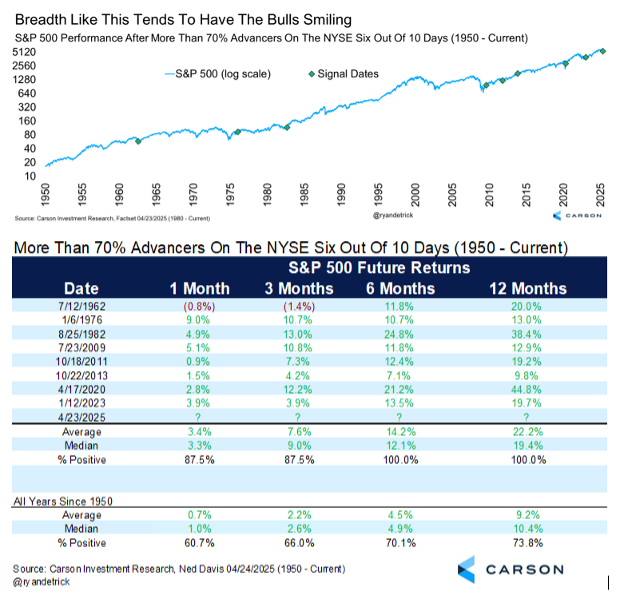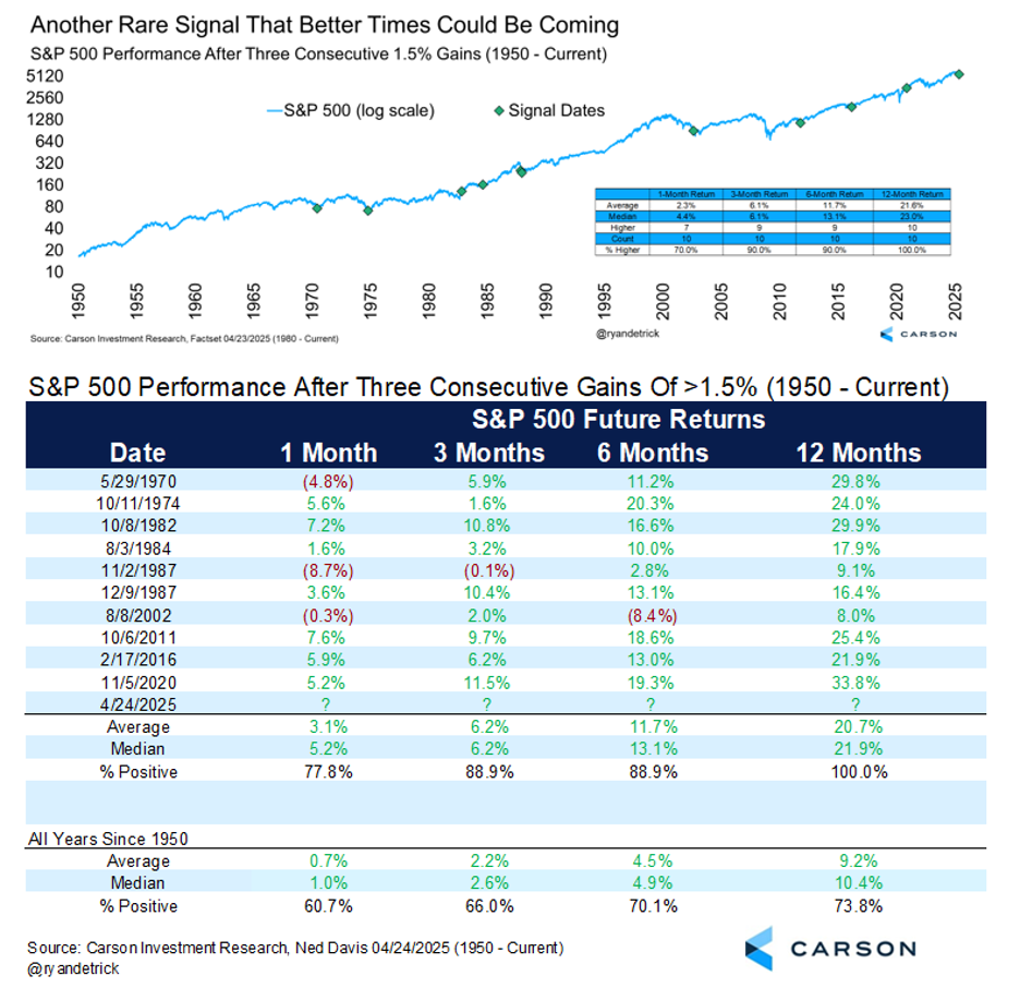 Dates like the lows in 1982, 2009, and 2020 show up this time, which always catches our attention. The next six months were never lower and up more than 14% on average; the next year higher every time and up more than 22% on average. Those numbers could have bulls smiling later in 2025.
