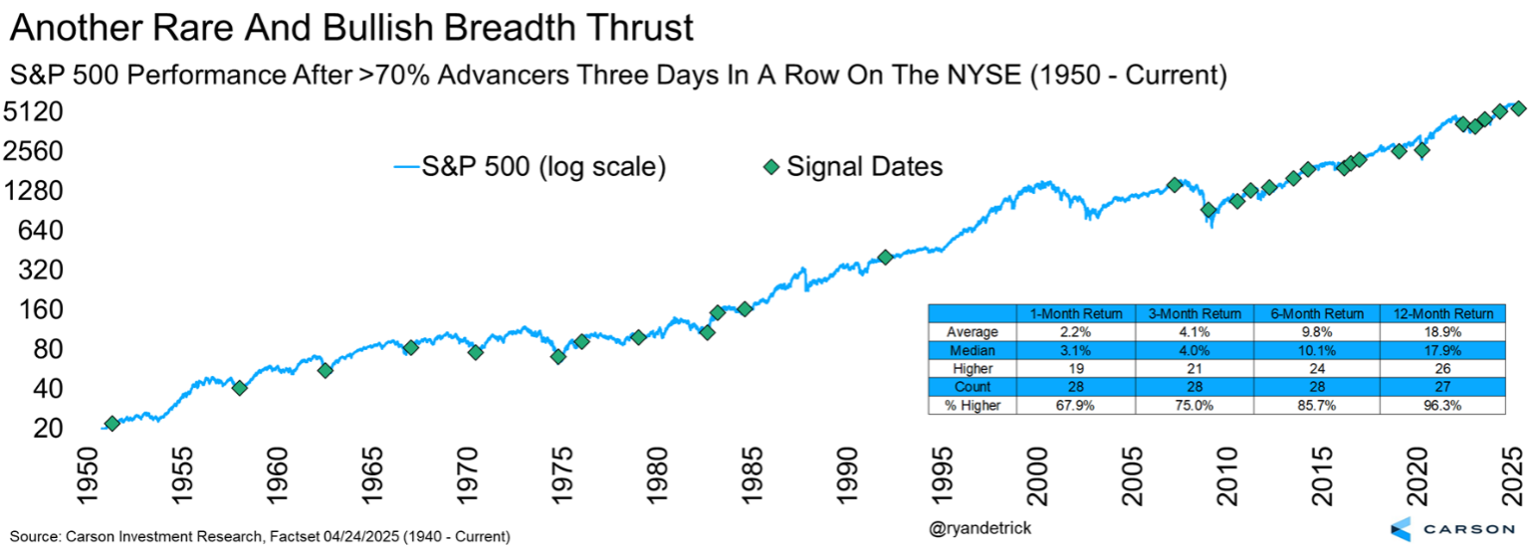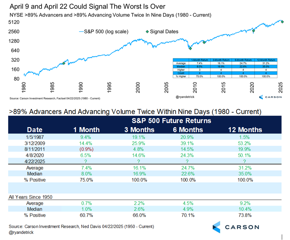 Some of the other dates we saw two days this strong this close to each other? Early 1987, March 2009, August 2011 (after the US debt downgrade), and the COVID lows in March 2020. Again, small sample size, but we wouldn’t be ignoring this one. Another thing to note—all those prior times, policymakers stepped in to provide relief in a big way. There’s a chance we could see that again this time around if the Trump administration dials back tariffs significantly (although this is more righting a self-inflicted wrong than policy support), we get a meaningful fiscal stimulus bill, and the Fed can cut rates in the back half of the year. More on these possibilities below.