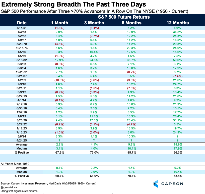 More than 70% of the stocks on the NYSE were higher Tuesday – Thursday of last week, another rare and potentially bullish clue. After this signal stocks have also shown strong future performance historically and have been higher a year later 26 out of 27 times.