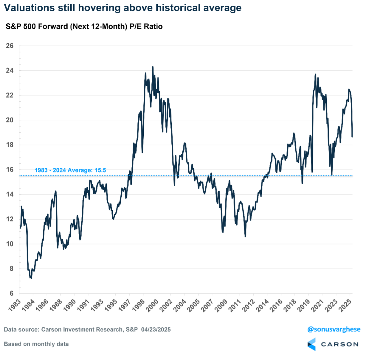 The forward P/E ratio for the S&P 500 is currently between 18 and 19. It was 22.4 at the end of 2024, well above the 41-year average of 15.5.