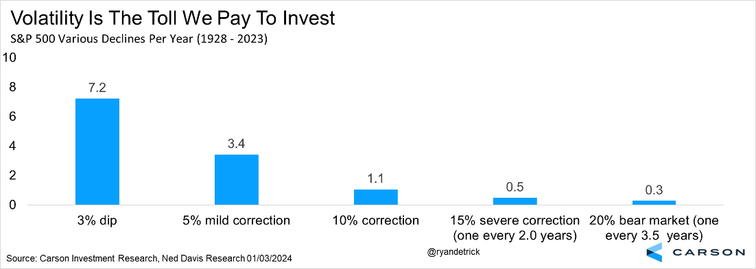 Below is a useful table from our friends at Ned Davis Research on market volatility. It shows that the average year has historically more than seven 3% dips, more than three 5% mild corrections, and one 10% correction. That puts this year into perspective, considering stocks have pulled back less than 3%, and serves as a reminder that more volatility could be in store.