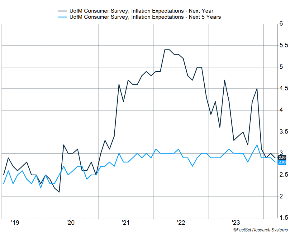 Consumer inflation expectations are not particularly accurate in forecasting future inflation. (It’s hard even for the Fed.) But we find it a useful way to gauge current inflation, because consumers usually project current inflation out into the future. And right now, consumers are saying inflation is running only slightly above where it was in 2019.