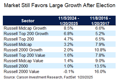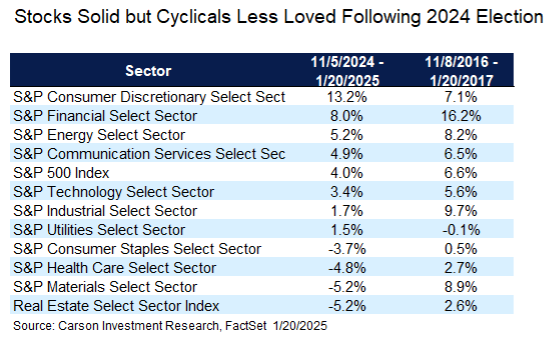 Getting back to our newly inaugurated president, markets have looked differently at the lead-up to Trump’s second term compared his first, but there are a couple of basic things they have in common. First, the S&P 500 has climbed higher. The period from election to inauguration has been a little lower this time around, +4.0% versus +6.6% in 2016 – 2017, but 4.0% in less than three months is still above average.