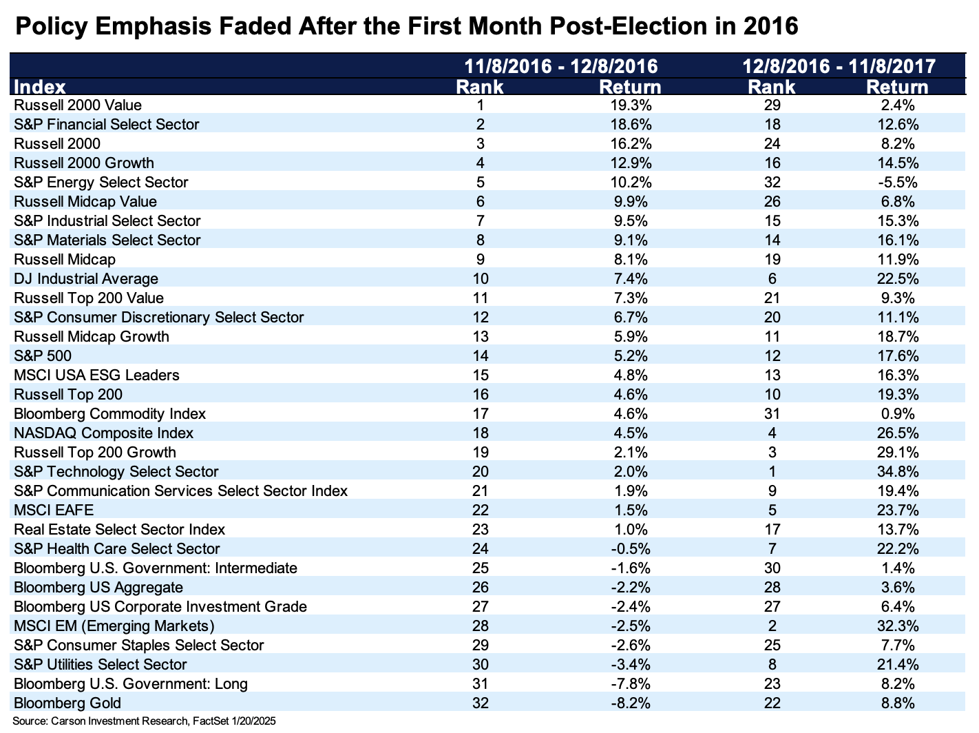 Monday was inauguration day, a good moment to check back on what we have seen from markets since election day. We also can compare market performance to 2016, which saw prospects of a similar policy shift to what we have currently.