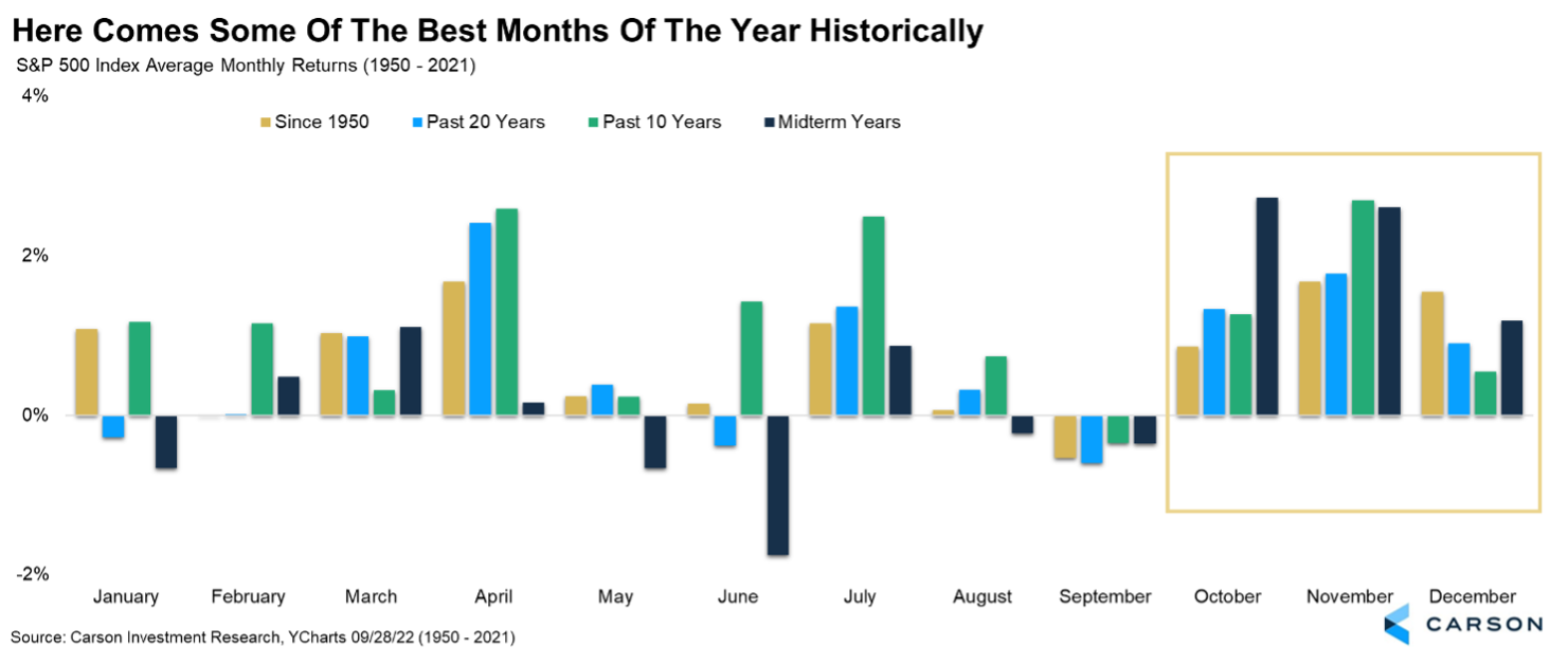 Is all hope lost? We don’t think so. In fact, we think there is still a good chance for stocks to rally by year-end. Now, let’s get this out of the way. October has seen some spectacular crashes. 1929, 1987, and 2008 all saw some of the largest monthly declines ever, and they all took place in October. But we like to say October gets a bad rap, as historically it hasn’t been that bad. In fact, during midterm election years October has been the best month of the year, followed by November and then December. Historically, midterm years are weak to start with big gains later on. We think that’s possible this year.