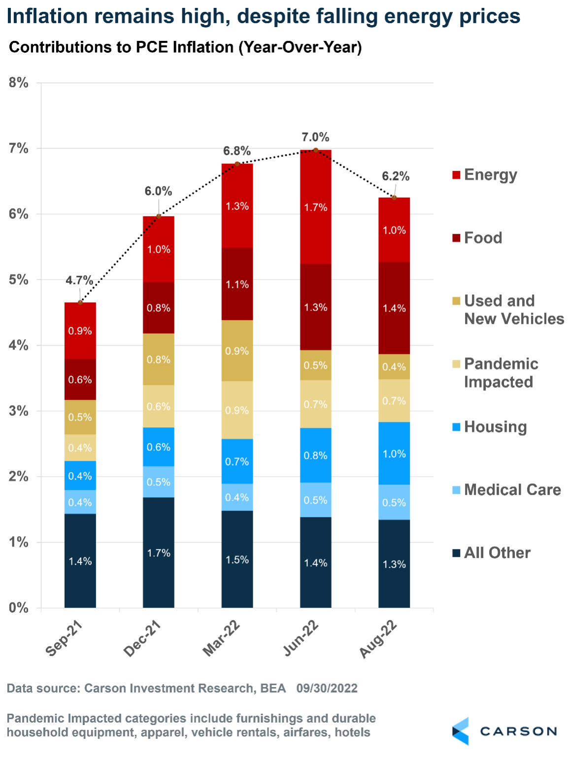 We keep looking for inflation to break lower, but Lucy continues to take the football away. The Federal Reserve’s preferred measure of inflation, the price index based on personal consumption expenditures (PCE), came in above expectations for August. Headline inflation rose 0.3% in August and is now up 6.2% from a year ago. That’s lower than June’s 7% pace, but it’s not falling fast enough, despite the sharp drop in energy prices.