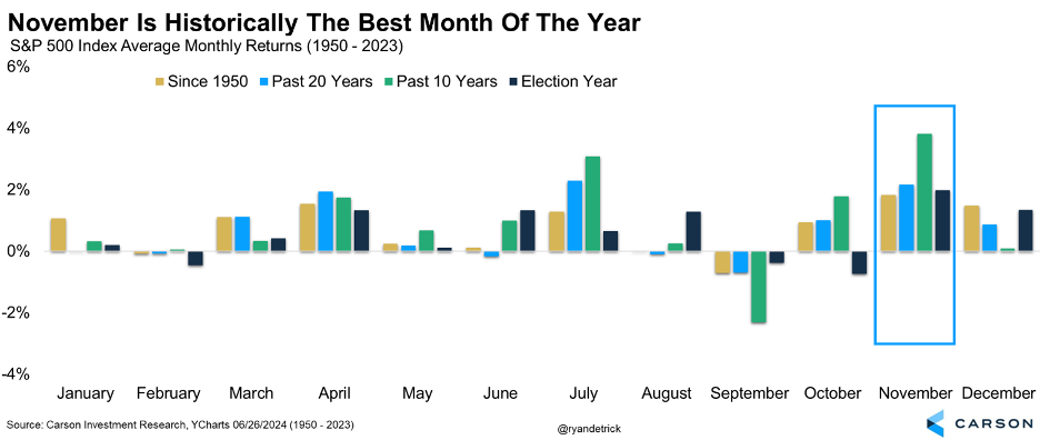 Did you hear there’s an election tomorrow? Yes, we are finally there. As we discussed in detail last week, while of course the election matters, historically who is in the White House hasn’t mattered as much to investors as you might think. If the economy remains strong (as we expect), that would matter much more than just about anything else. We will say this about the election — we could see some market volatility this week, although the extra days it took to determine the winner in 2020 actually saw market strength. If we do see some volatility, keep your eyes on the prize and remember the longer-term trends remain quite solid.