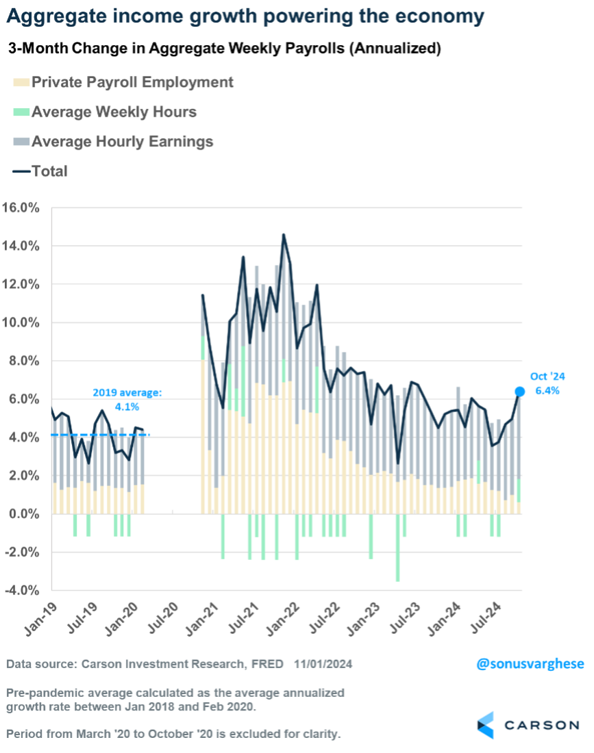 What really matters for an economy that depends on consumer spending is aggregate income growth, i.e. income growth across all workers in the economy. That’s the sum of employment growth, wage growth, and the change in hours worked. Despite the negative revisions to August and September payrolls, and the huge hit from hurricanes and strikes to October payrolls, aggregate income growth is running at a 6.4% annualized pace over the past three months. That’s well above the 4.1% pace we saw pre-pandemic.