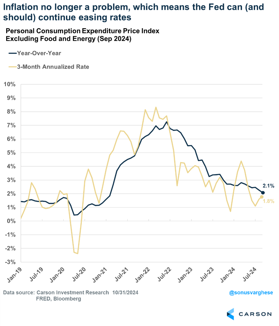 It’s about risk reduction at this point, and the good news is that they can continue easing rates because inflation has normalized. That’s thanks to lower gas prices and easing housing inflation. Headline inflation is up 2.1% year over year as of September, which is the slowest pace since February 2021 (as measured by the Fed’s preferred metric, the Personal Consumption Expenditures Index). That should give the Fed plenty of scope to continue to normalize rates.