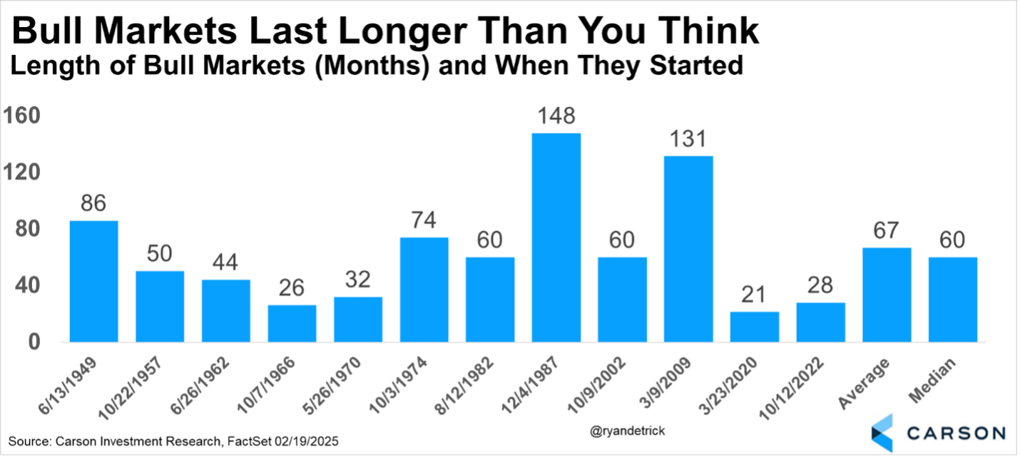 There are likely many more reasons, but one we want to make sure we highlight again is that this bull market is still young. As we show here, it is now only 28 months old and bull markets tend to last many more years once they get to this point. In fact, going back 50 years the five bull markets that made it into their third year (like this one) lasted an average of eight years total and the shortest was five years.