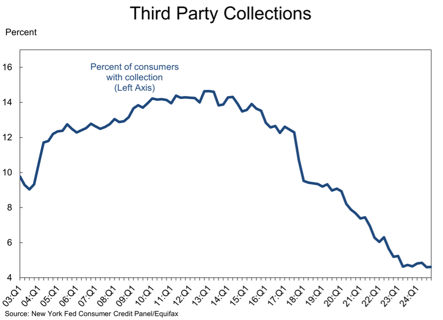 If households were really getting stretched, and there was a lot of broad pockets of payment distress, we would see third party collections soar. It’s the opposite. Only 4.6% of households had collections against them in Q4, and that’s actually lower than the 4.7% of a year ago. It averaged 9.2% across 2019.