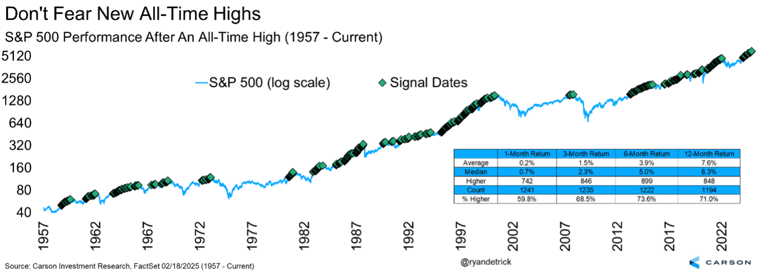 It is important to understand that new highs are very common and tend to happen more than you’d think. Starting in 1957 (when the S&P 500 moved to 500 stocks) a new high has been hit about every three weeks, with more than 1,200 new highs along the way. Looking at what happens after all of those new highs, stocks were higher a year later 71.0% of the time and up a median of 8.3%, so about what you tend to see in any random year. Yes, some day there will be a new high that is the last one and rough times could be right around the corner. The good news is we don’t see that happening anytime soon and 2025 still looks like it should be a nice year for investors.