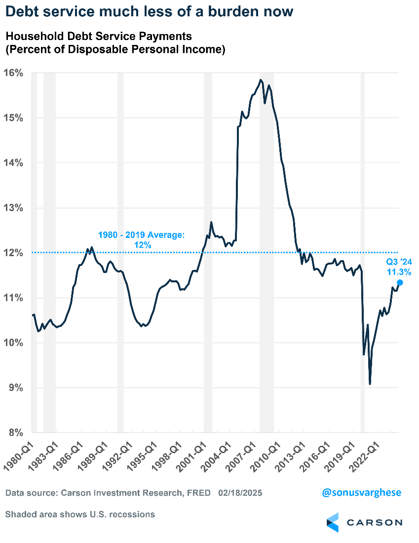 It’s remarkable that disposable incomes have grown faster than overall debt for the second year in a row (2023 and 2024). That becomes important because disposable income is used for servicing debt. Debt service payments are just 11.3% of disposable income right now, below the 1980–2019 average of 12% and even below the 2019 average of 11.7%. Also remember that 2019 was the end of a decade of deleveraging. Household balance sheets got hit by the Financial Crisis, as stock prices and home prices fell, and households spent the following decade rebuilding them. So, debt service running below 2019 levels is a huge positive.