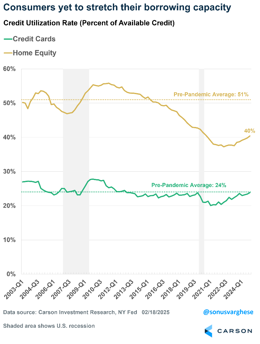 Home equity credit utilization was also unchanged at 40%, which leaves it well below the historical average of 51%. We think this is the main dry powder consumers have, and it’s likely to increase as home prices rise. Of course, we need interest rates to pull back for consumers to start accessing this dry powder, but it’s there.