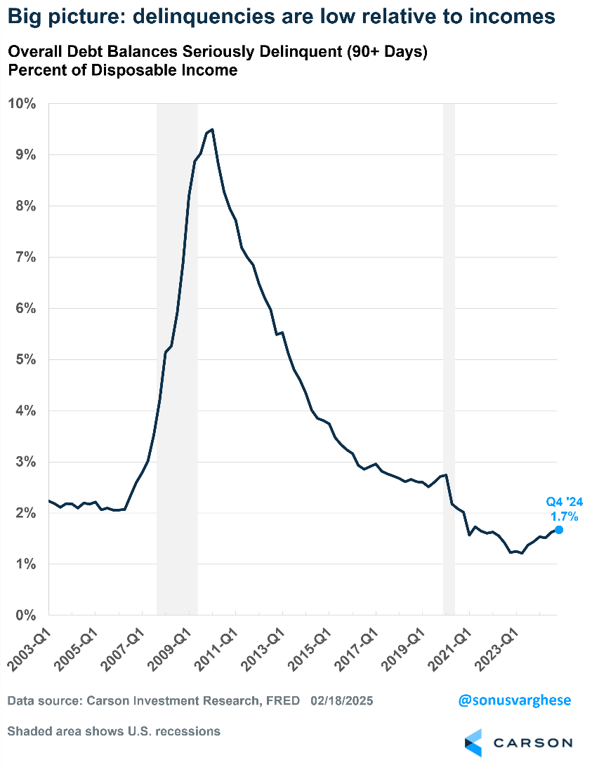 All this tells you how strong household balance sheets are, and the lack of distress relative to history (even relative to a the end of a solid deleveraging cycle like 2019). This is not to say that there are no risks out there. There certainly are, as we highlighted in our 2025 Outlook, but it’s not because households are over-levered.