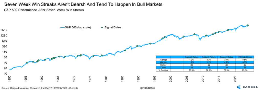 In fact, the S&P 500 is up a very impressive eight weeks in a row currently, the first eight-week streak in about six years. Long weekly win streaks like this may seem bearish, but they are usually not. In fact, streaks like this often appear in bull markets and continued strong price action is normal. Reviewing all the seven-week win streaks (not including last week) that have taken place since 1950 showed that stocks were higher one year later 25 out of 29 times, or more than 86% of the time. That’s the first recent signal we’ve seen that suggests the next 12 months could provide another good year for the bulls.