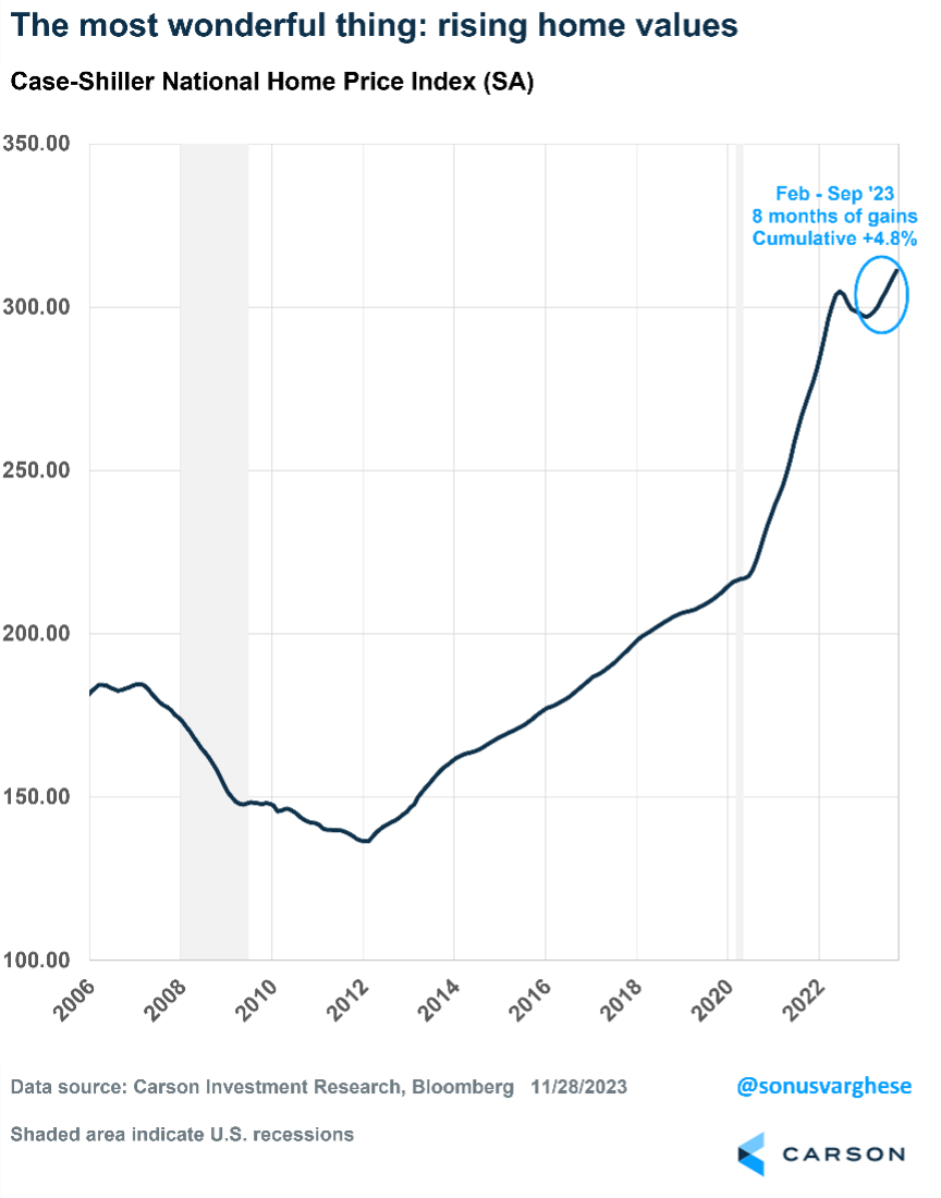 Third, 30-year fixed mortgage rates have fallen from 8% to almost 6.5%. Thanks to markets pricing in interest-rate cuts by the Federal Reserve next year, mortgage rates have fallen sharply. While 6.5% is higher than the mortgage rate most homeowners pay, which is 3-4%, there’s a massive cohort of 25-34-year-olds who want homes but are being priced out, assuming they can even find a home to buy. Lower mortgage rates boost perceptions of home affordability.