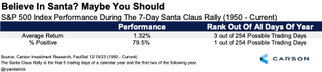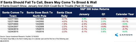 The table below shows recent times investors were given coal during these seven days, and the results aren’t very good at all. The last five times (going back 30 years) that the SCR was negative, January was down as well. Notably, there was no SCR in 2000 and 2008. These were not the best times for investors, and the missing rally was potentially a major warning that something wasn’t right. Lastly, the whole year was negative in 1994 and 2015 after no Santa. We like to say in the Carson Investment Research team that hope isn’t a strategy, but I’m hoping for some green during the SCR!