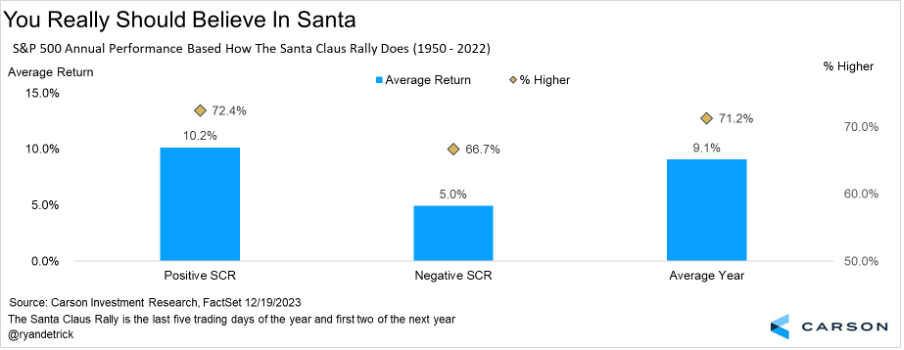 The average yearly gain for the S&P 500 has been 9.1% since 1950 and the index has risen 71.2% of the time. But when there is an SCR, those numbers jump to 10.2% and 72.4%. They fall to only 5.0% and 66.7% when there is no Santa. While this is only one indicator and investors should consider many factors when making investment decisions, we wouldn’t advise ignoring this trend.