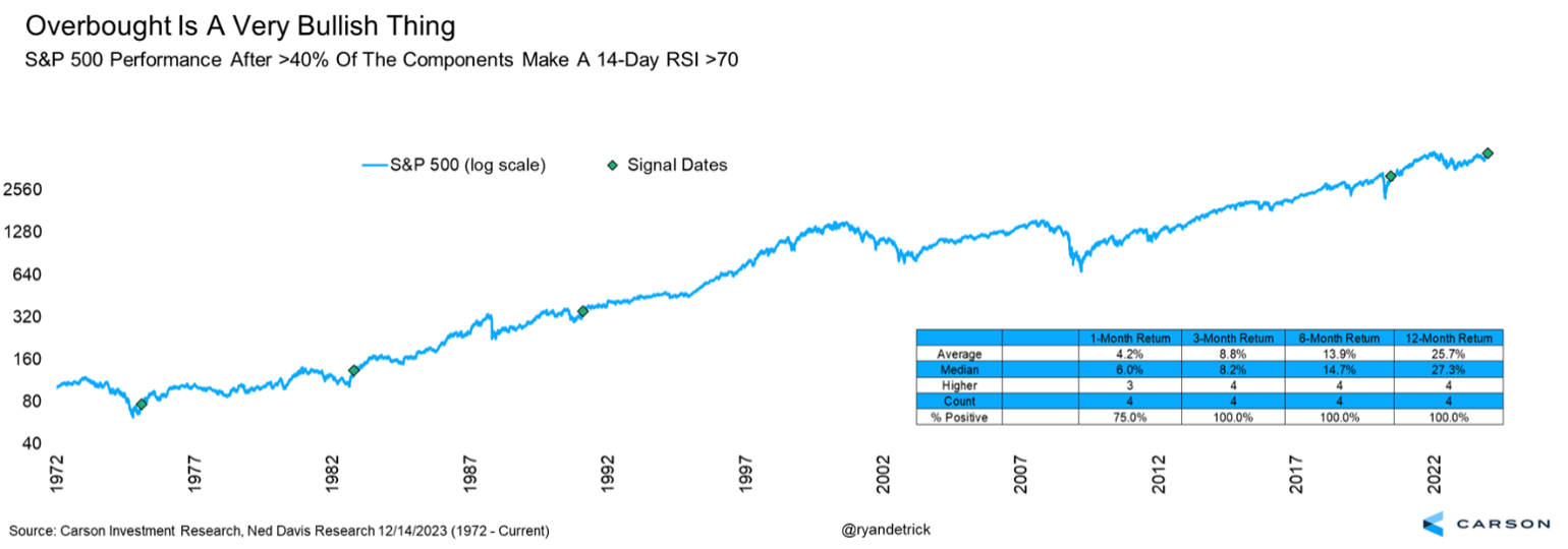 Another rare, yet potentially bullish, signal provides our third reason to expect higher prices in 2024. Recently, more than 40% of the components of the S&P 500 saw an RSI of more than 70. The RSI (or Relative Strength Index) is an overbought/oversold indicator, the general guideline of which is above 70 is overbought and below 30 is oversold. You can read more about the RSI from our friends at Investopedia here.