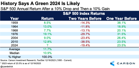 Here’s our final reason to be bullish in 2024. When stocks have dropped more than 10%, such as they did in 2022, then jumped more than 10%, such as they did this year, the following year has tended to be quite solid. Stocks have risen six out of six times with an 11.7% gain on average.