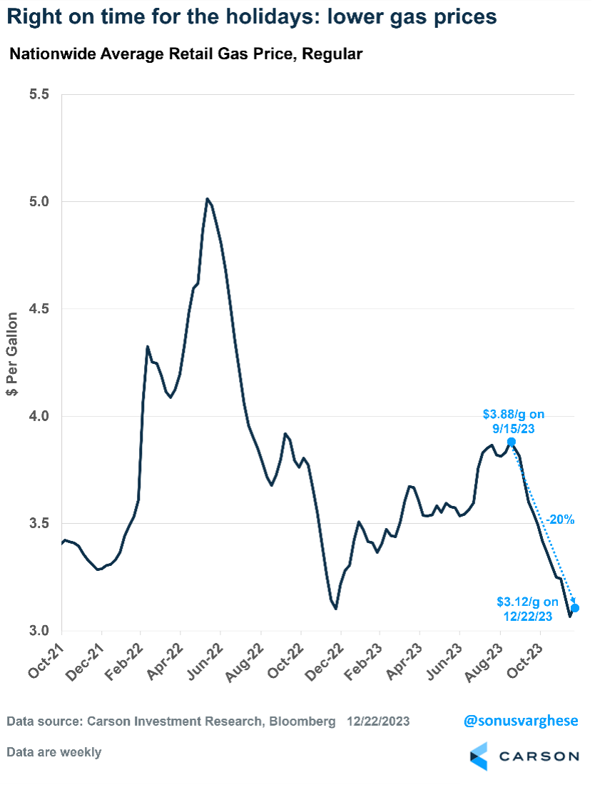 Second, gas prices have fallen 20% since mid-September. Nationwide, average gas prices have fallen from $3.88/gallon in mid-September to $3.12/gallon. That’s as good a Christmas present as any. Gas prices are perhaps the most salient part of inflation, and lower prices give households the perception that inflation is easing, never mind what official data suggests.