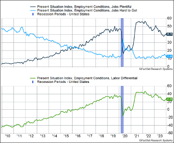 The labor market continues to run strong. The data has shown the labor market has been strong for a long time, with the unemployment rate below 4% throughout this year. But perhaps more importantly for consumer confidence, the perception of the labor market has improved. In The Conference Board’s consumer survey in December, the percentage of respondents saying “jobs are plentiful” rose 2.1 points to 40.7%, while the percentage of respondents saying “jobs are hard to get” fell by 2.4 points to 13.2%. The “labor differential,” which is the difference between the two, edged up 4.5 points to 27.5, which is close to pre-pandemic levels and suggests Americans are feeling good about the labor market.