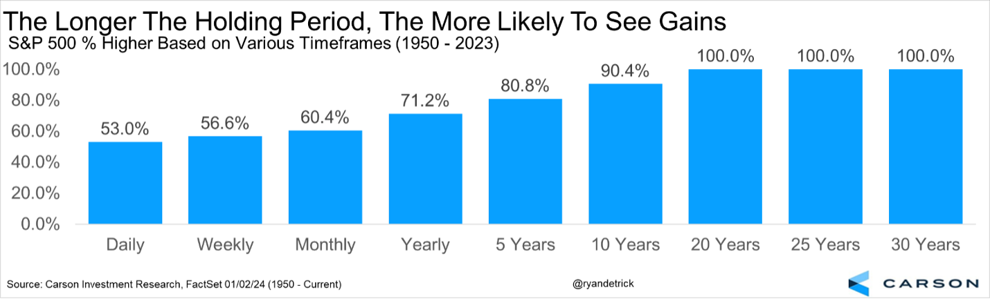 Time can be an investor’s best friend. Each year will have scary headlines and reasons to sell, but that doesn’t mean you should. In fact, the longer you are willing to hold, the most likely you’ll make money. On any random day the odds of stocks being higher is about a coin flip at 53%. A full week? 56.6%. A full month? 60.4%. A year? 71.2%. Five years? 80.8%. 10 years? 90.4%. And over 20 years stocks have never been lower.