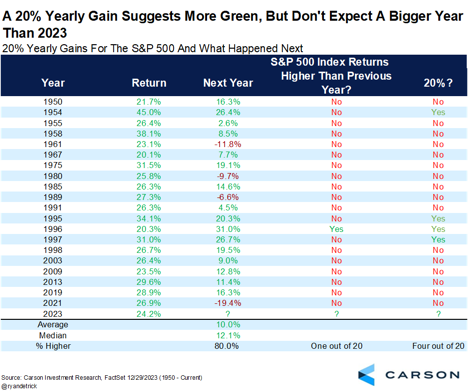 • It would be extremely rare for stocks to gain more in 2024 than they did in 2023. Only once in history (1997) did the S&P 500 follow up with a bigger gain after the previous year was up more than 20%.