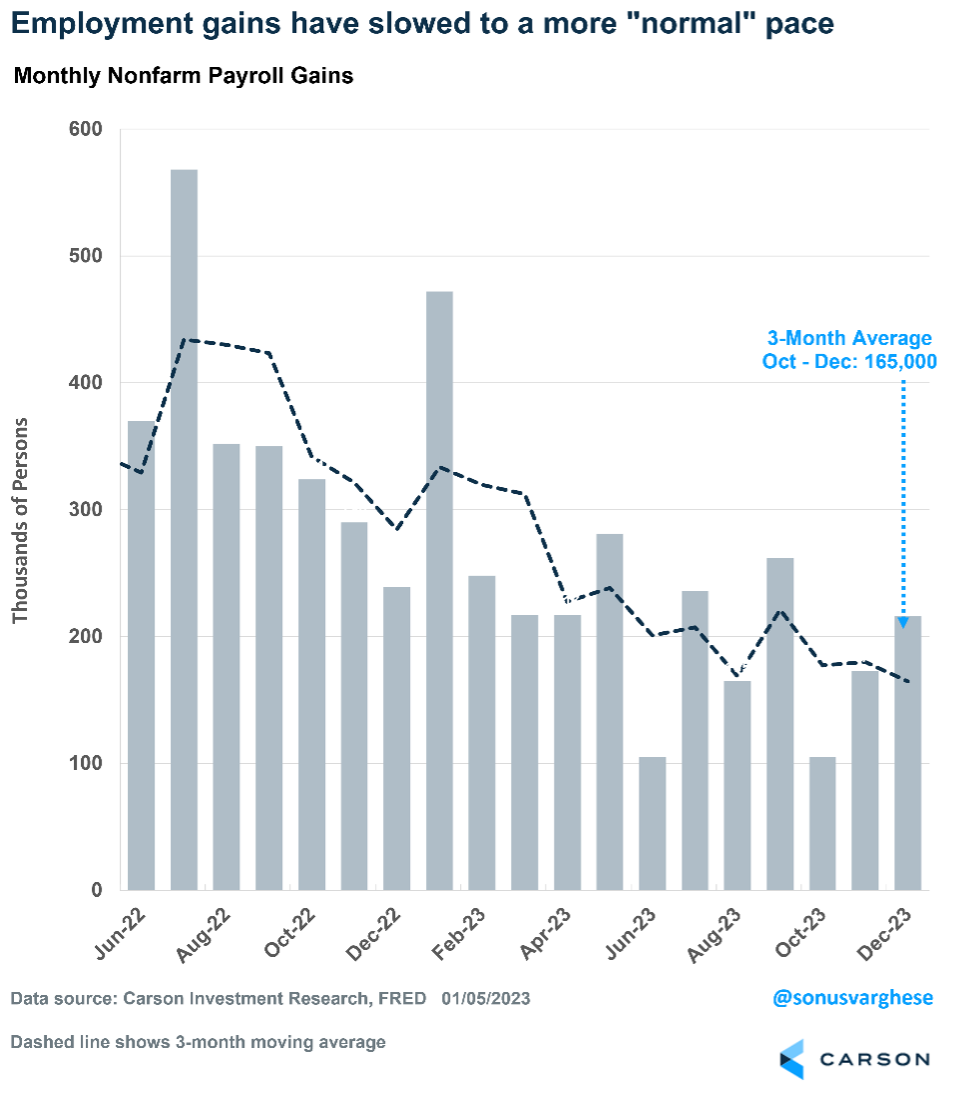 The December payroll report was strong on the surface, with 216,000 jobs created last month and the unemployment rate firm at 3.7%. December was the 23rd straight month in which the unemployment rate has remained below 4%. That is the longest stretch since the late 1960s, which indicates the economy is in a healthy place. All in all, 2023 was another banner year for job creation, with the addition of 2.7 million jobs. While that is lower than the 4.8 million jobs created in 2022, average annual job creation per year since 1940 is just 1.5 million, or 2.6 million excluding years with negative job growth, which occur during recessions. In fact, the average annual number of jobs gained from 2010-2019 was 2.2 million.