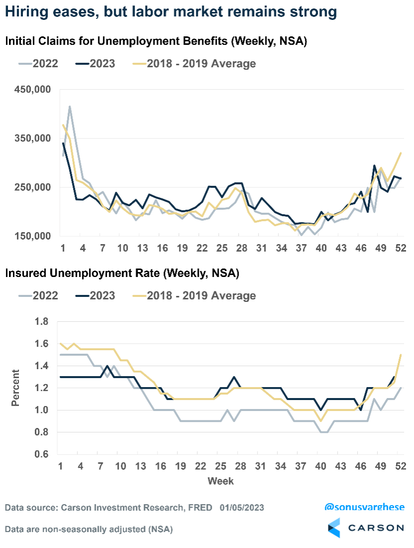 One of the better leading indicators for employment, and the economy, are claims for unemployment benefits. The top panel of the chart below shows initial claims for unemployment benefits across the entire year (2023 in dark blue), compared to claims in 2022 (gray) and the average across 2018-2019 (yellow). It indicates layoffs remain low, which is why initial claims for unemployment benefits match the low levels seen in 2022 and even 2018-2019.