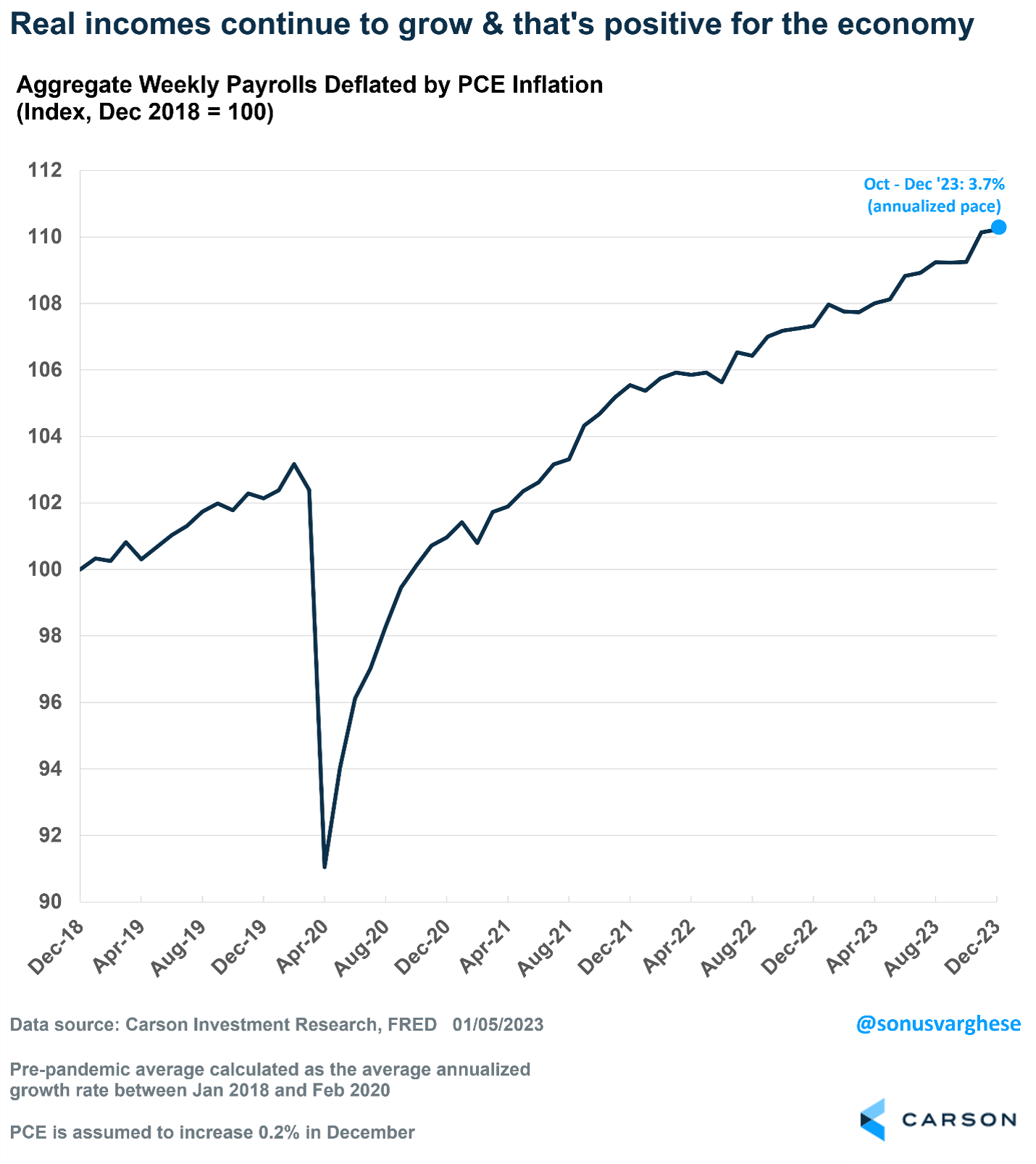 As we frequently point out, household consumption comprises 70% of the economy, and that is directly driven by income growth. To understand the underlying potential speed of the economy, there’s no better place to look than aggregate income growth, i.e., income growth across all workers in the economy. It’s a combination of: