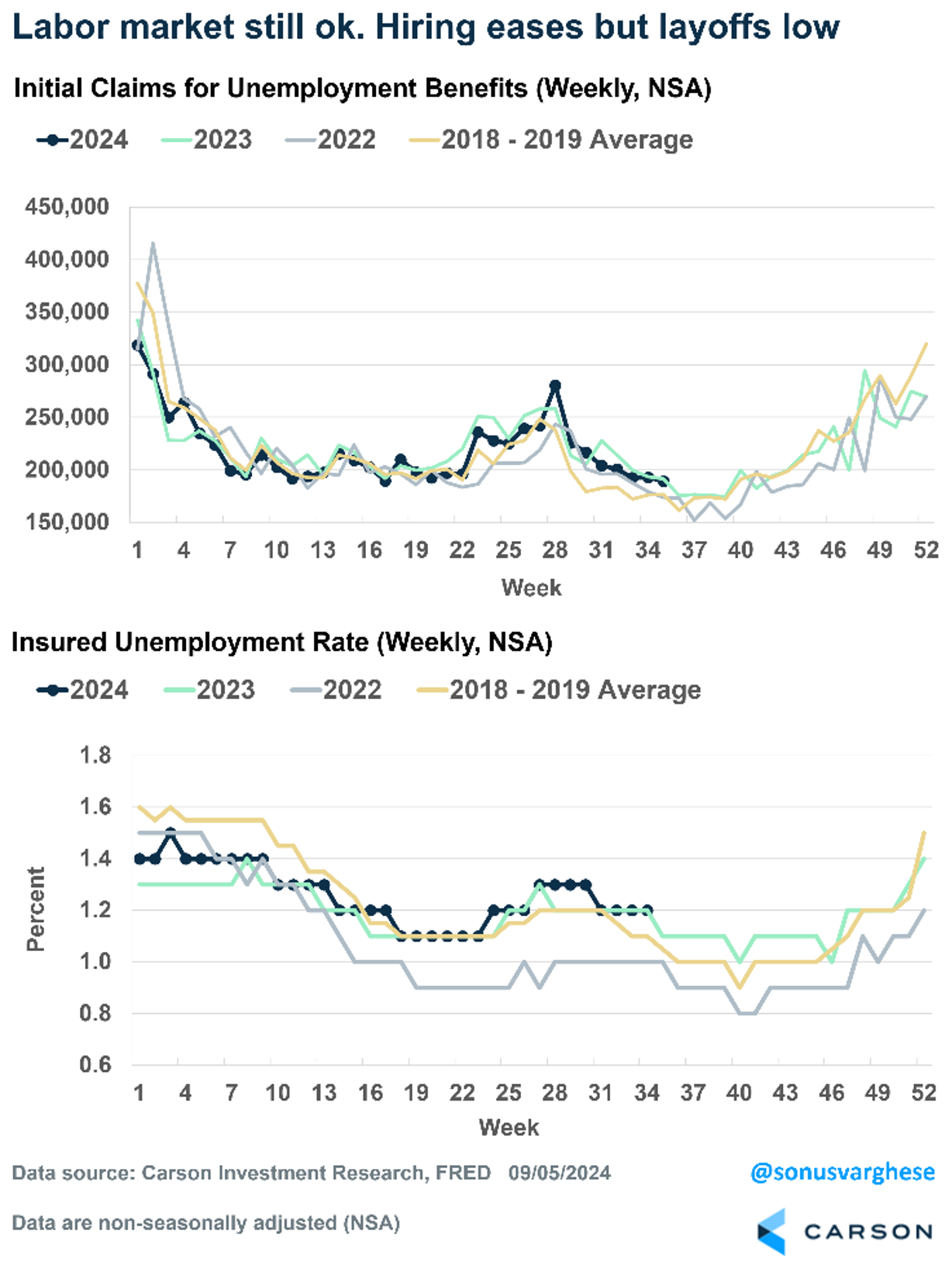 Layoffs are also low, which should also tell you we’re not in the middle of a recession or very close to one. The layoff rate, which is layoffs as a percent of employment, is running at 1.1%. That’s historically low. For perspective, it was running around 1.2-1.3% from 2017-2019, and around 1.3-1.6% from 2005-2007. Also, initial claims for unemployment benefits, which is one of the better leading economic indicators out there (if you had to pick one) still shows layoffs remain low, in line with what we saw in 2023 amid a strong labor market and even 2018-20019. The “insured unemployment rate,” which measures the number of unemployed people continuing to receive unemployment benefits as a percent of covered employment, is at 1.2% – above where it was pre-pandemic. All of this tells you that people aren’t at great risk of losing jobs, but finding a job has gotten harder (which is why continuing claims for benefits are higher).