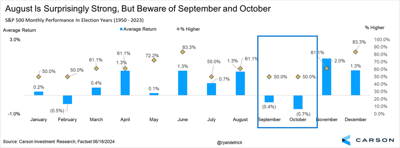 Are we still bullish? Yes, we remain overweight equities, which is where we have been since December 2022. But we can’t ignore the potential for some pre-election jitters and seasonal weakness over the coming two months. September has been the worst month of the year the past 10 years, 20 years, and since 1950. In election years it is the third worst month (February and October have been worse).
