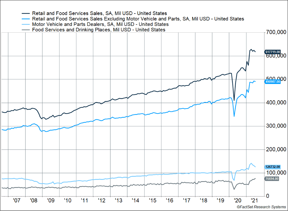 As long as retail sales growth continues to be above the previous trend, our expectation is the market will perceive the economic recovery to be on solid ground. Some economists seem to have high expectations for the economic support provided millions of Americans to be self-reinforcing and kick growth to high levels. Our expectation was the economy would benefit from the stimulus, but those gains are likely to slow as stimulus support gets more distant each day. The priority remains making it safe for consumers to venture out and for workers to return to work.
