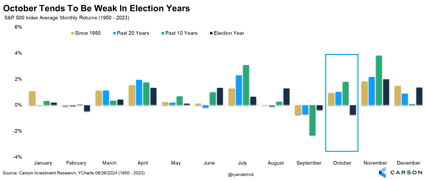 You will be hearing a lot about how October is a month known for high market volatility and large drawdowns. This is true, as 1929, 1987, and 2008 all saw spectacular meltdowns in this spooky month. But it is worth noting that overall October is really about an average month, up 0.9% on average, making it the 7th best month of the year. The past 10 years it has gained a very respectable 1.8%, making it the third best month of the year. It was down last year, but hasn’t declined two years in a row for 15 years. October is the worse month during an election year and after the incredible run stocks have seen so far this year, we wouldn’t be surprised at all if we saw some usual October volatility in 2024.