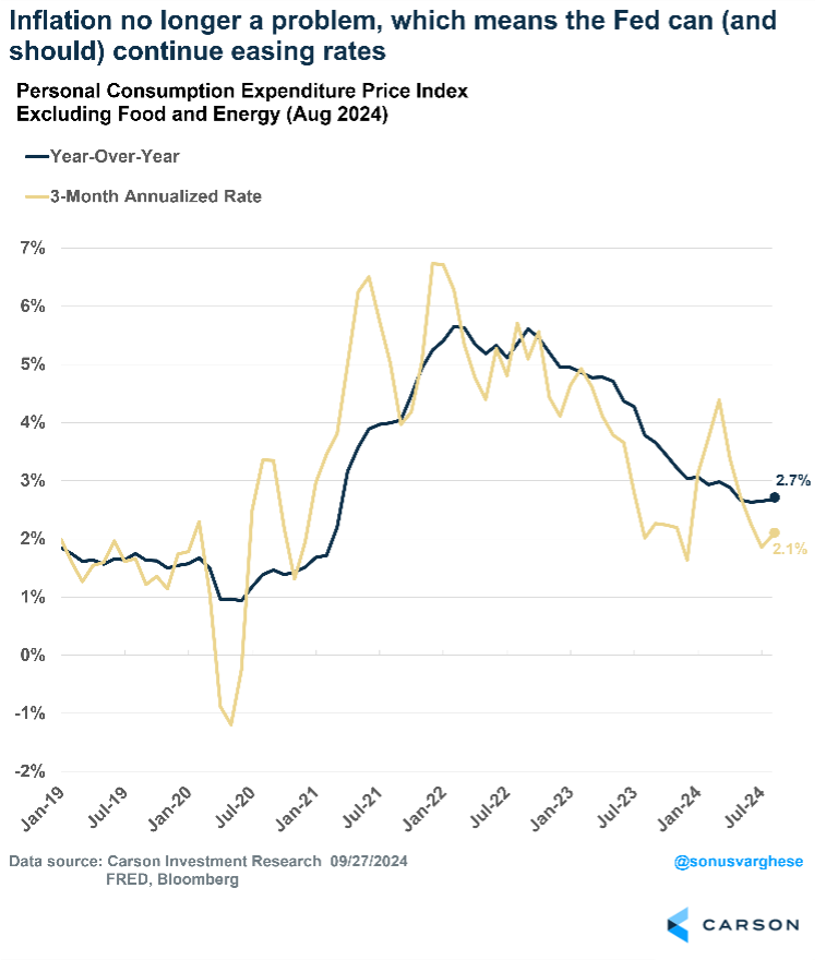 Upward GDP growth revisions imply productivity growth is likely stronger than reported. It was already strong, running at a 2.9% annualized pace over the last five quarters (compared to a 1.5% annualized pace from 2005-2019). Income growth has been really strong as well, with employee compensation running up over 6% over the past year through August. Yet, inflation has continuously eased. The core personal consumption expenditures index (PCE), which is the Fed’s preferred inflation metric, has eased from 3.8% a year ago to 2.7% as of August 2024. Over the last three months, it’s running at a 2.1% annualized pace, barely above the Federal Reserve’s (Fed) 2% target.