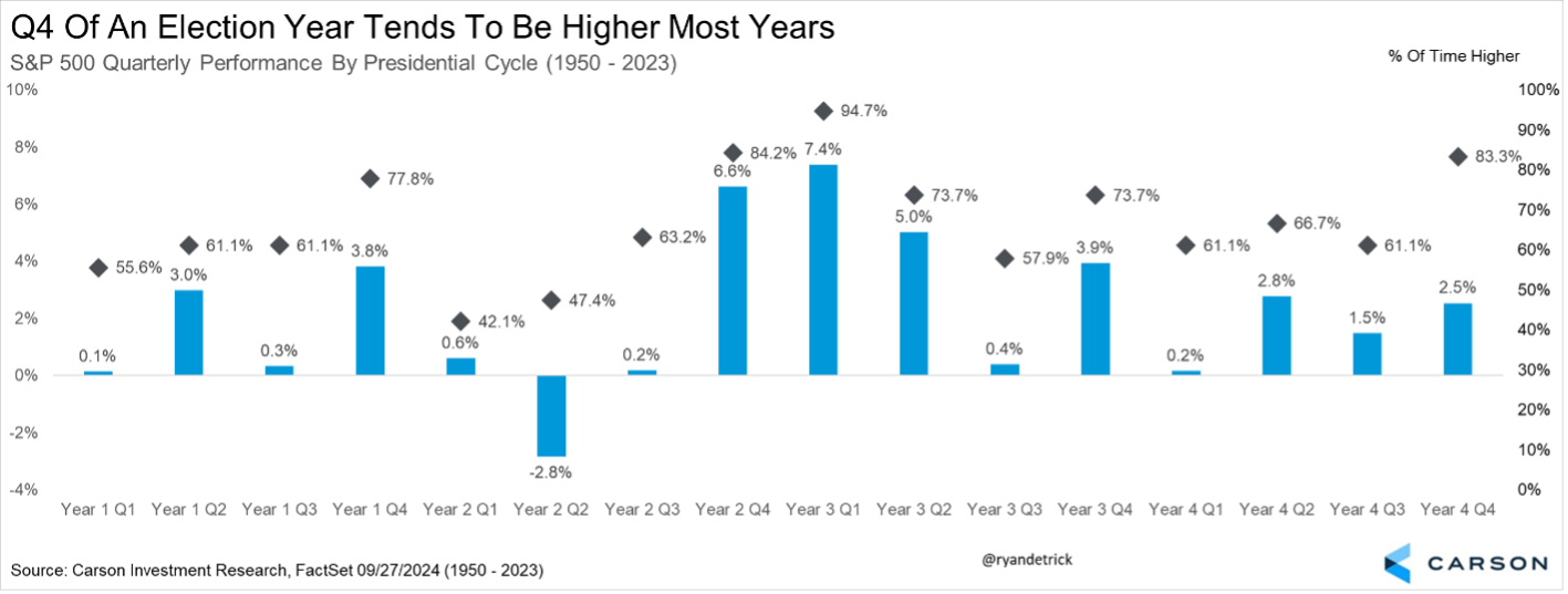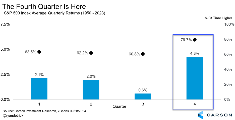 Looking past possible October volatility, the fourth quarter overall is higher nearly 80% of the time and up 4.3% on average, making it far and away the best quarter of the year.