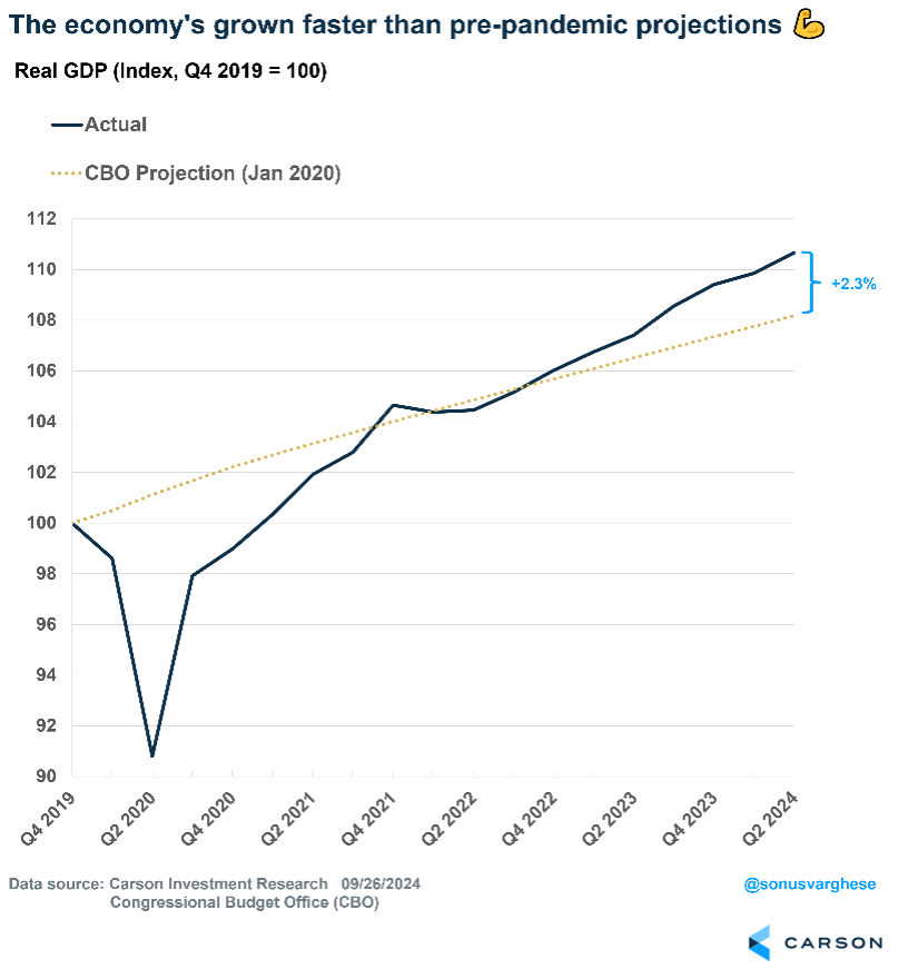 One of my favorite charts is the one below, which compares Congressional Budget Office (CBO) pre-pandemic projections for growth to actual growth. Actual real GDP growth is running 2.3% above what the CBO projected back in January 2020. Remember, this is after a worldwide pandemic, 40+ year highs in inflation, and an ultra-aggressive Fed. There’s a reason why the S&P 500 has risen over 90% over this same period, and that was because economic activity drove profit growth.