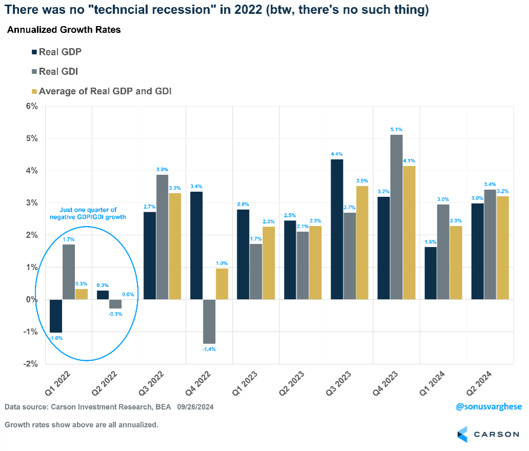 By the way, with the revision there was no “technical recession” in 2022. A technical recession is colloquially described as two consecutive quarters of negative GDP growth. However, it’s typically used for countries other than the US. That’s because in the US, a recession is officially “dated” by the National Bureau of Economic Research (NBER). The NBER recession dating committee does not use GDP (or GDI), instead focusing on six other economic indicators measuring consumption, income, employment, sales and production. The prior data showed that GDP growth was negative in Q1 and Q2 of 2022, prompting a hue and cry from the bears who were apoplectic that a recession wasn’t “called.” Never mind that most economic indicators pointed away from a recession even in mid-2022. We spent a lot of time pushing back against the recession narrative over the last two years, whether on the Facts vs Feelings podcast, in our blogs, and even in our Outlooks. Well, Q2 2022 GDP growth was revised up, and now we don’t have two consecutive quarters of negative GDP growth. Another narrative bites the dust.